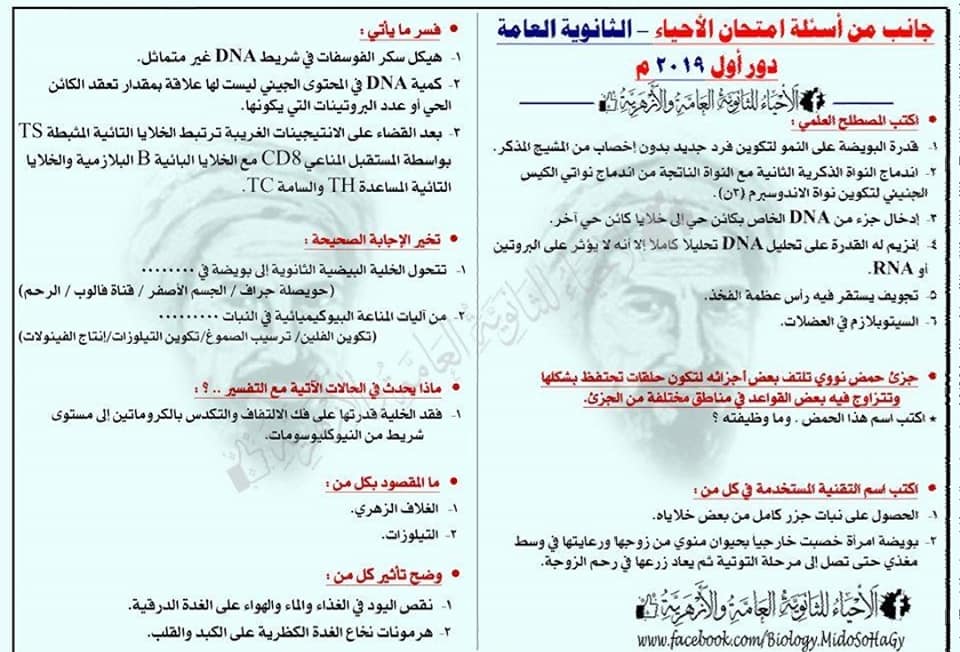 امتحان الاحياء للصف الثالث الثانوى للثانوية العامة دور أول 2019 كامل مع نموذج الاجابة
