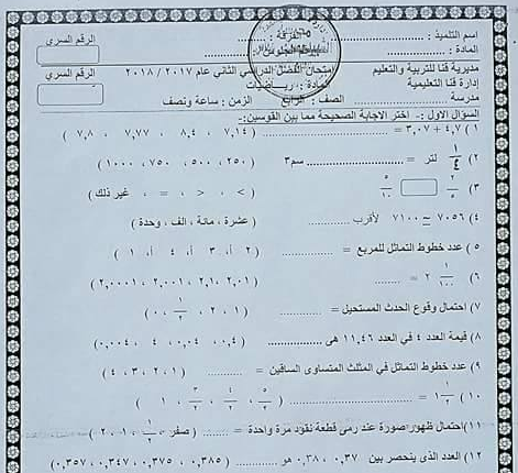 امتحان الرياضيات للصف الرابع الابتدائي ترم ثانى 2018 ادارة قنا التعليمية محافظة قنا تم امتحانة فعلا