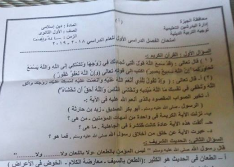امتحان التربية الاسلامية للصف الاول الثانوى ترم اول 2019 لمحافظة الجيزة