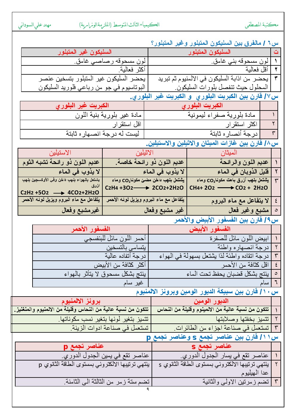 جميع الفروقات او مقارنات مادة الكيمياء الثالث متوسط 2016
