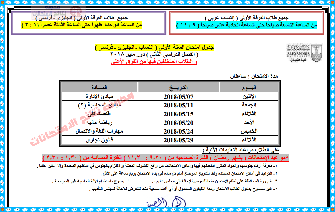 جدول امتحانات كلية التجارة جامعة الإسكندرية الترم الأول