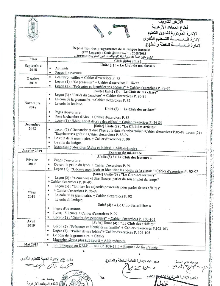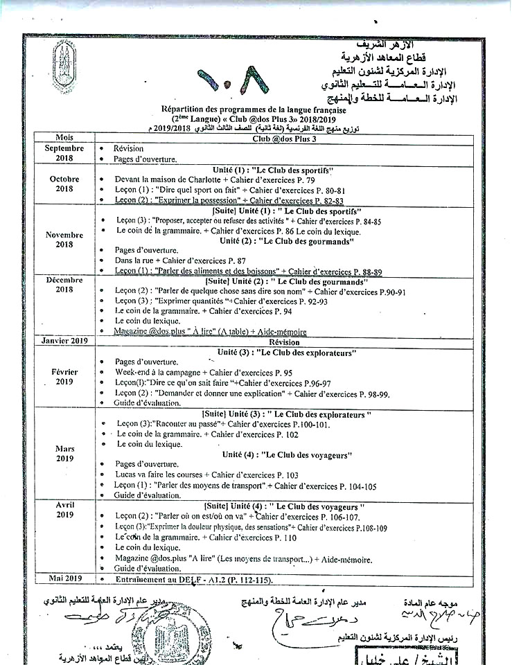 توزيع منهج اللغة الفرنسية للثانوية الازهرية 2019