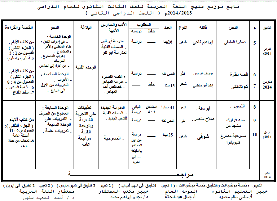 مناهج جديدة 2016 توزيع منهج اللغة العربية للصف الثالث الثانوى 2014